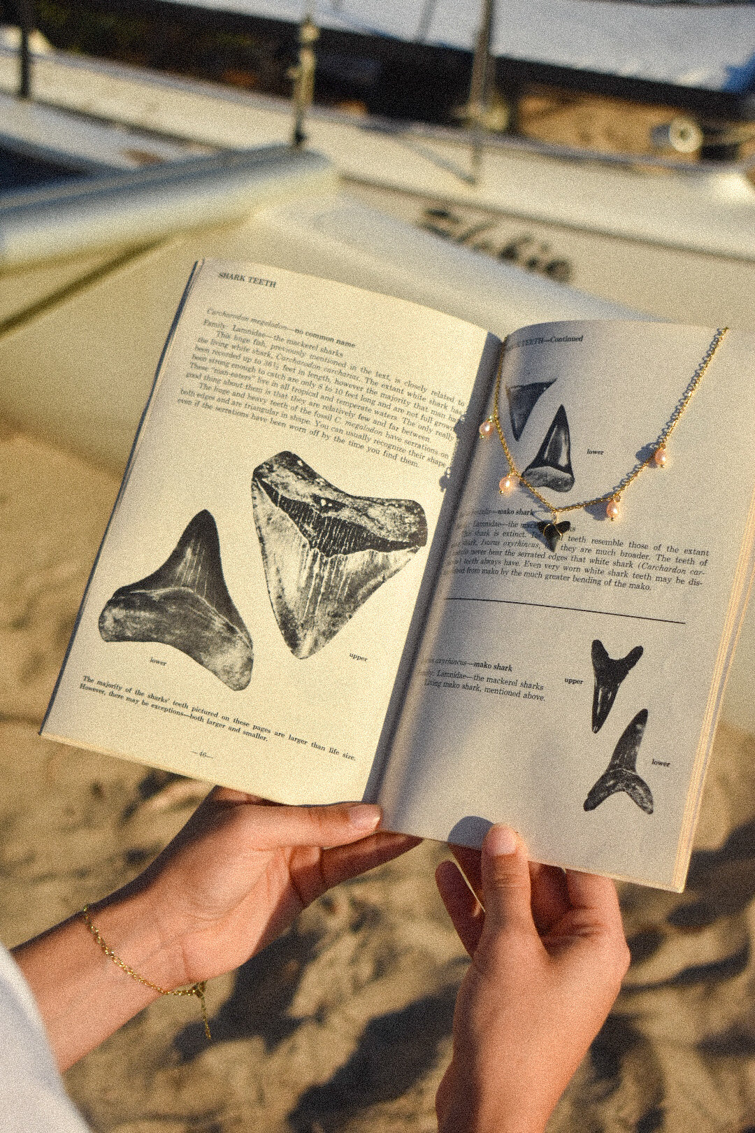 A dainty pearl-and-shark-tooth necklace. Features the beauty and fierceness of the shark.